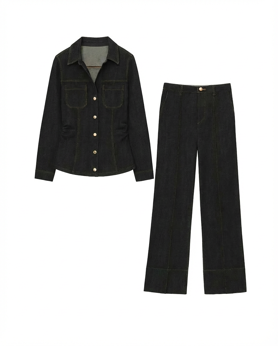 Komplet z Ciemnego Denimu | Koszula i Spodnie | Podkreślona Talia i Prosty Krój