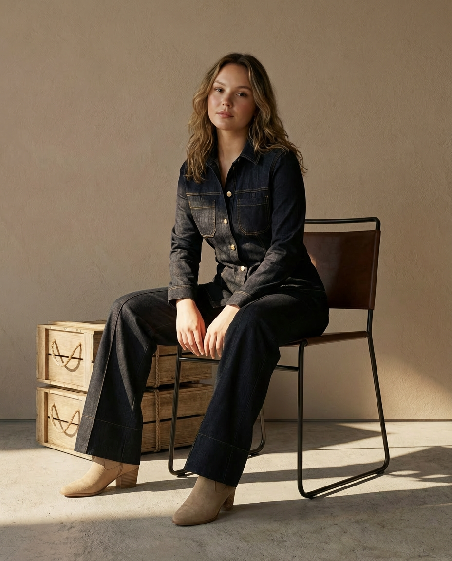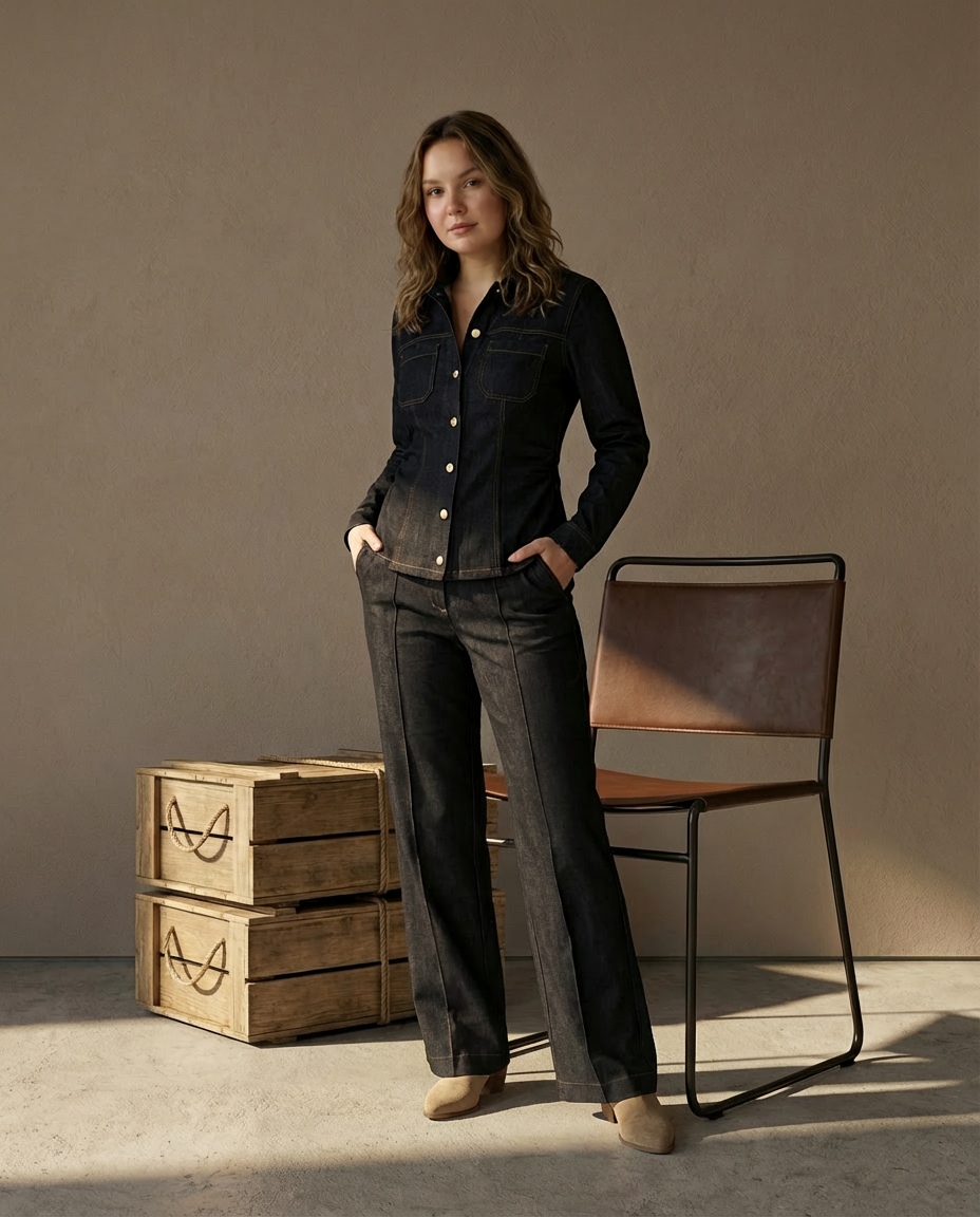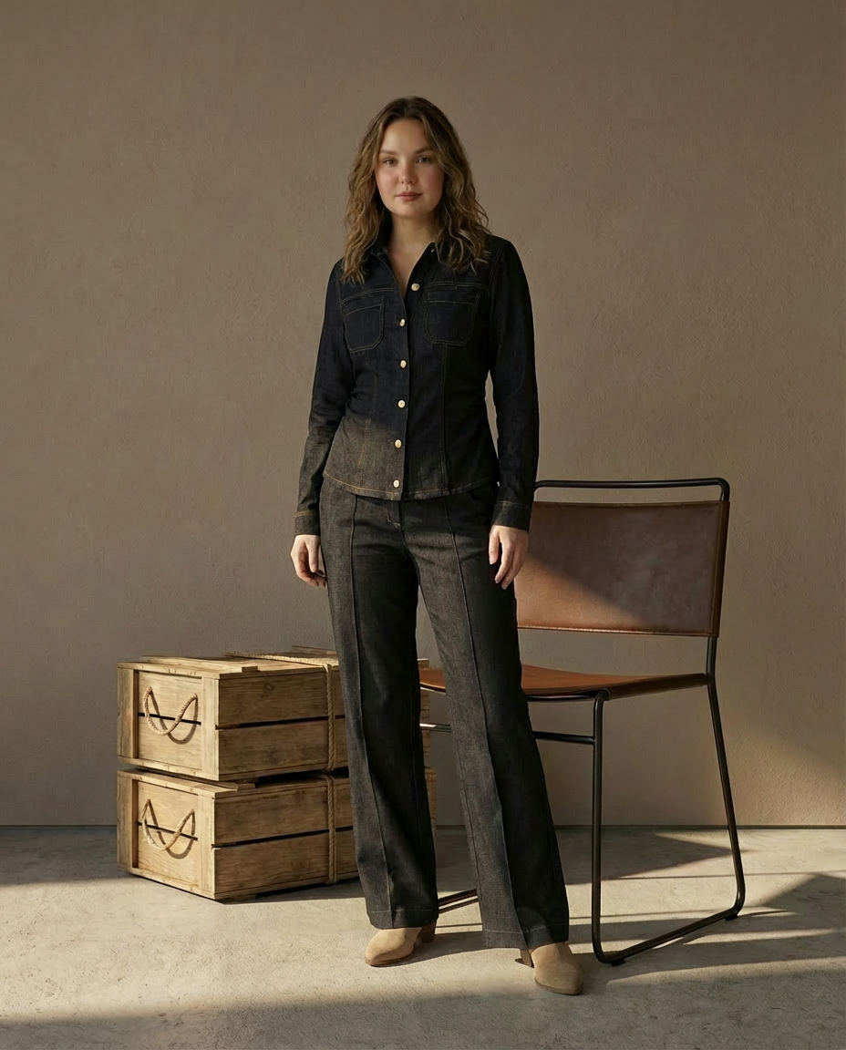 Marzysz o zestawie, który łączy klasykę denimu z kobiecym wykończeniem? Ten komplet składający się z koszuli i spodni to harmonijne połączenie struktury, wygody i stylu retro. Koszula z modelującymi przeszyciami i kieszeniami na piersiach doskonale dopasowuje się do sylwetki, a proste spodnie z zaprasowanym kantem wydłużają nogi i dodają elegancji. Zestaw stworzony do noszenia razem, ale również idealny do łączenia z innymi elementami garderoby.