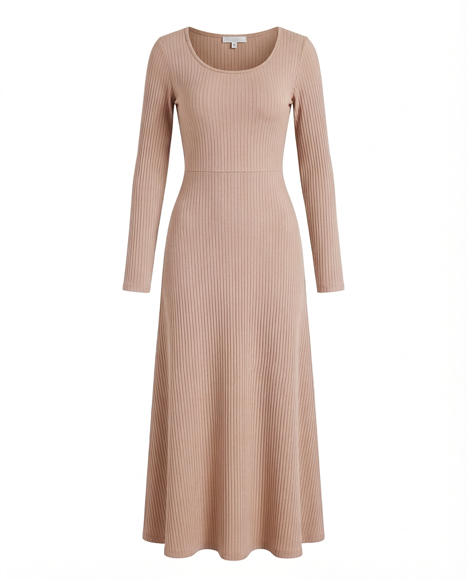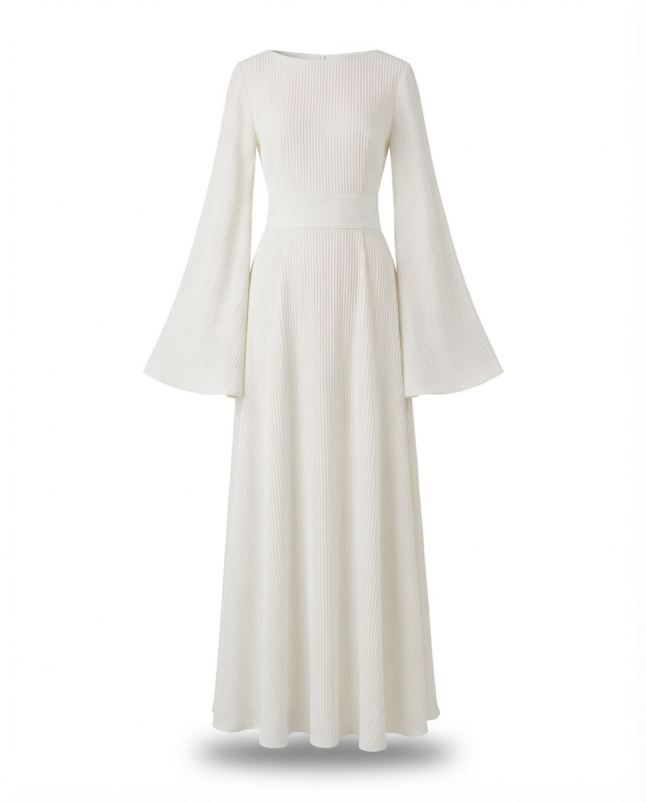 Sukienka Długa Prążkowana | Dopasowany Krój | Rozszerzane Rękawy | Na Co Dzień