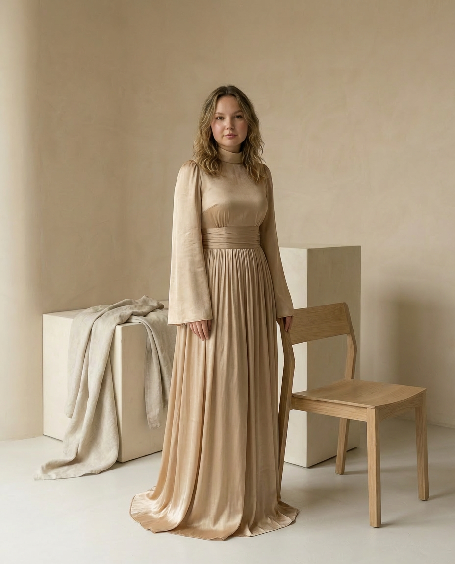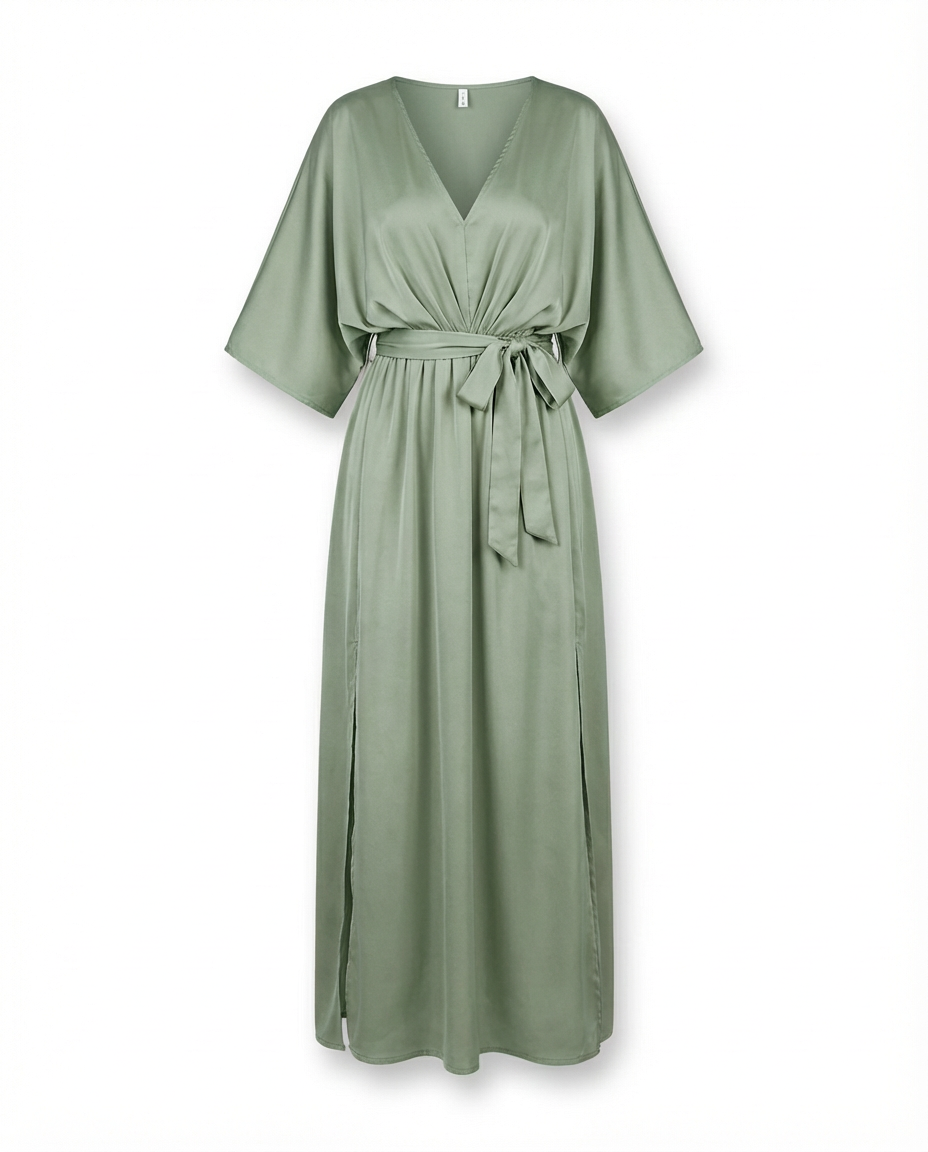 Satynowa sukienka wieczorowa | Drapowany dekolt | Elegancja z wysokim rozcięciem