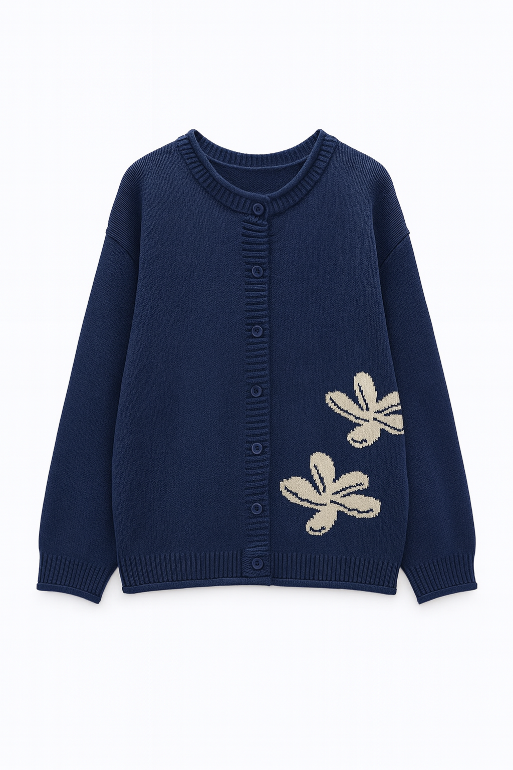 Kardigan Dzianinowy z Haftem Kwiatowym | Luźny Fason | Artystyczna Faktura