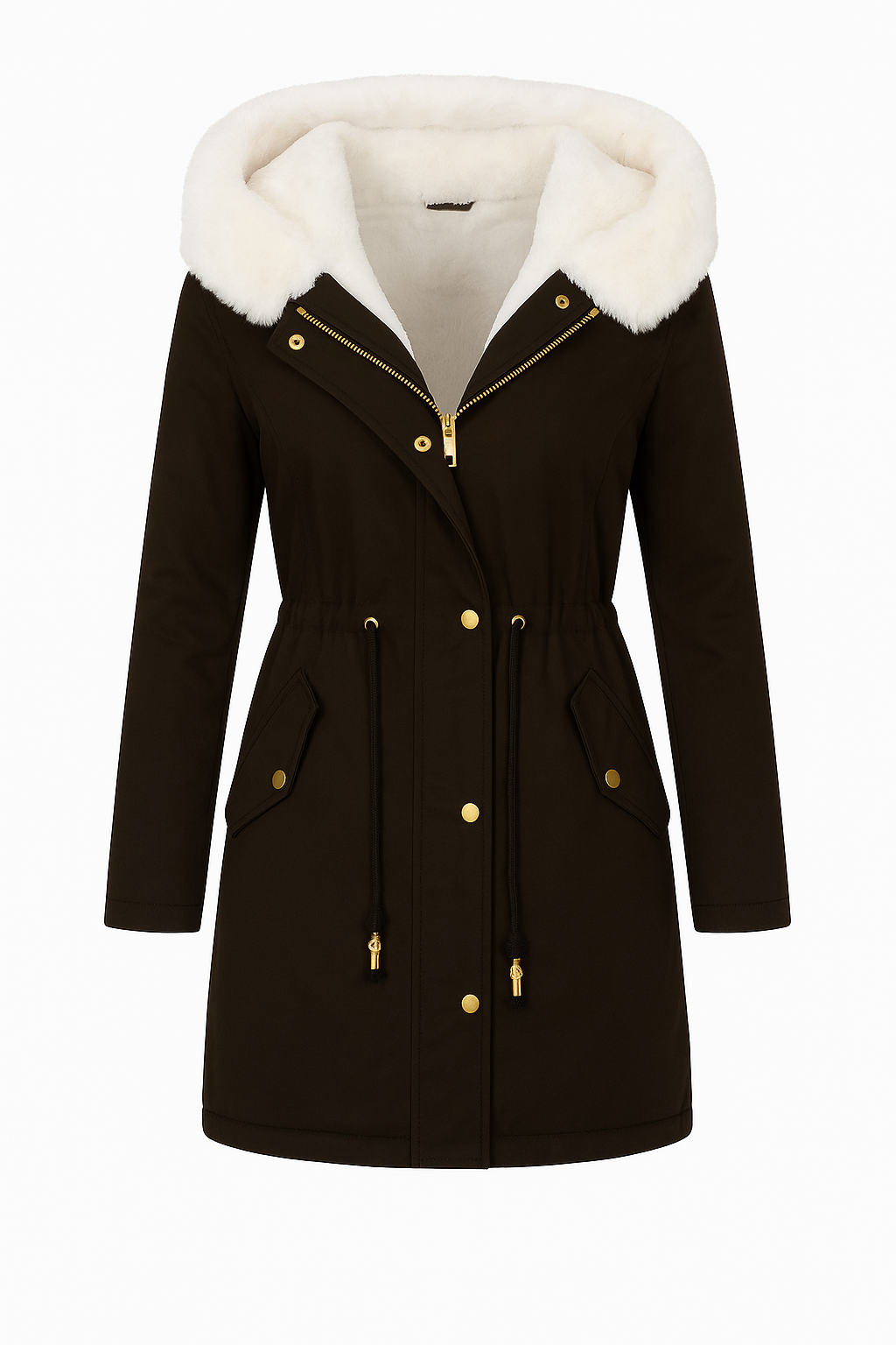 Kurtka Parka Damska z Futerkiem | Taliowany Fason | Złote Detale i Kaptur | Na Zimowe Dni