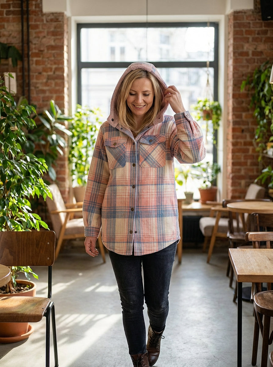Koszulowa Kurtka Damska w Kratę | Flanelowy Styl | Z Miękkim Kapturem | Na Chłodniejsze Dni