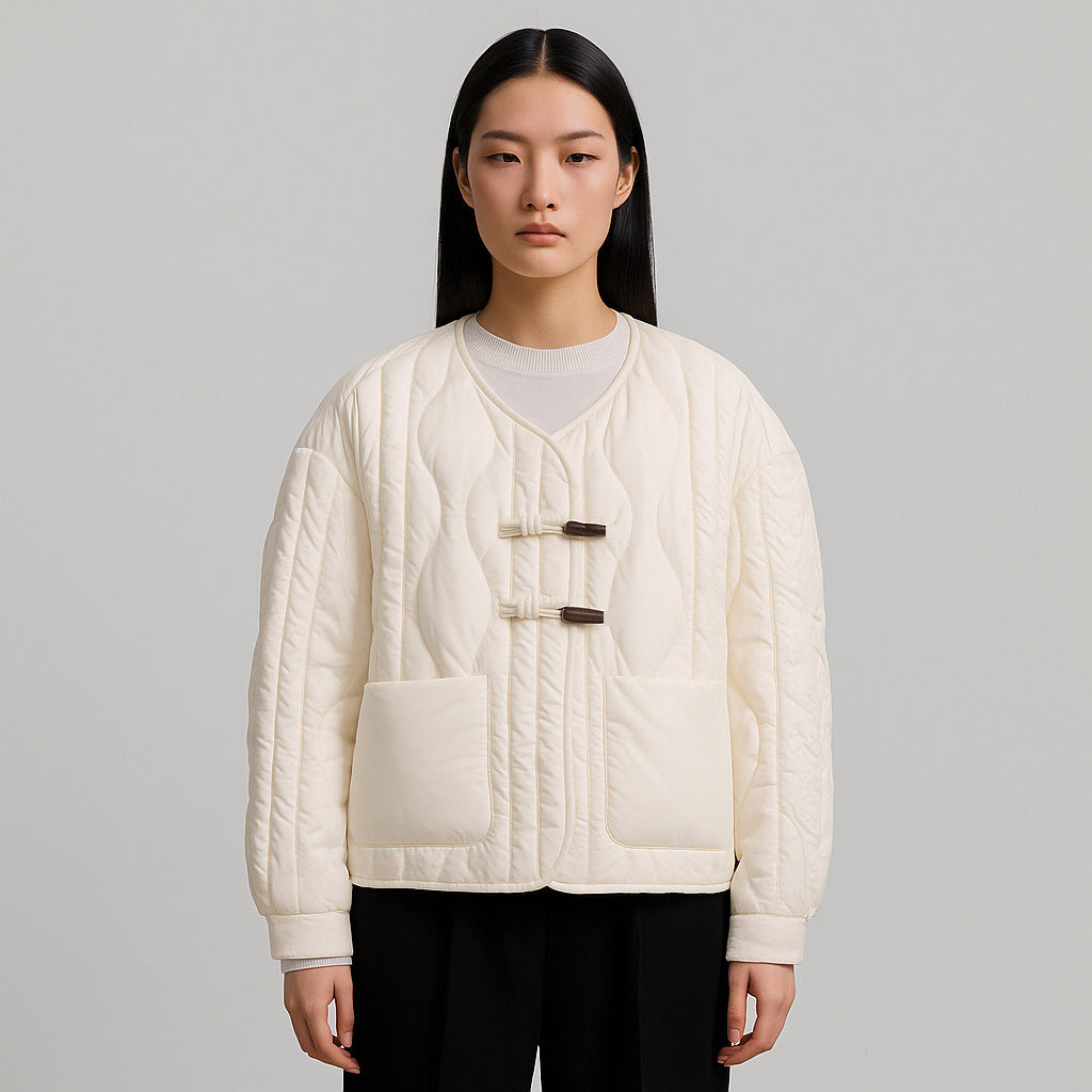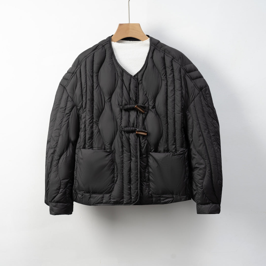 Szukasz alternatywy dla klasycznych kurtek puchowych? Ten model o prostym kroju i subtelnym pikowaniu wyróżnia się dekoltem w serek oraz wiązaniem zamiast tradycyjnego zamka. Geometryczne przeszycia podkreślają minimalistyczną formę, a lekkie wypełnienie sprawia, że kurtka świetnie sprawdza się na co dzień. Dwie obszerne kieszenie z przodu dodają funkcjonalności, nie zaburzając czystej linii projektu.