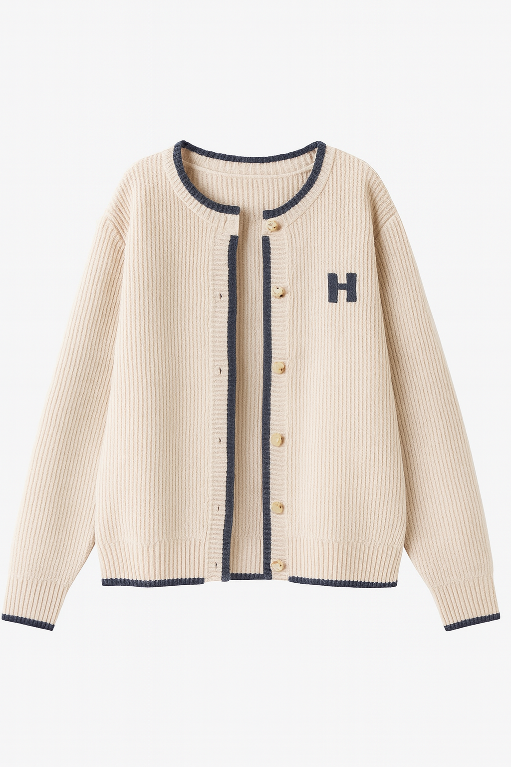 Kardigan Dzianinowy z Kontrastowym Wykończeniem | Luźny Krój | Haftowany Detal