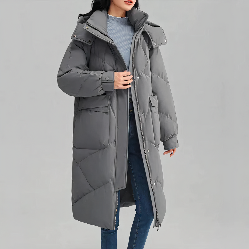Długi Płaszcz Pikowany z Kapturem | Wypełnienie Syntetyczne | Komfort i Osłona na Zimę