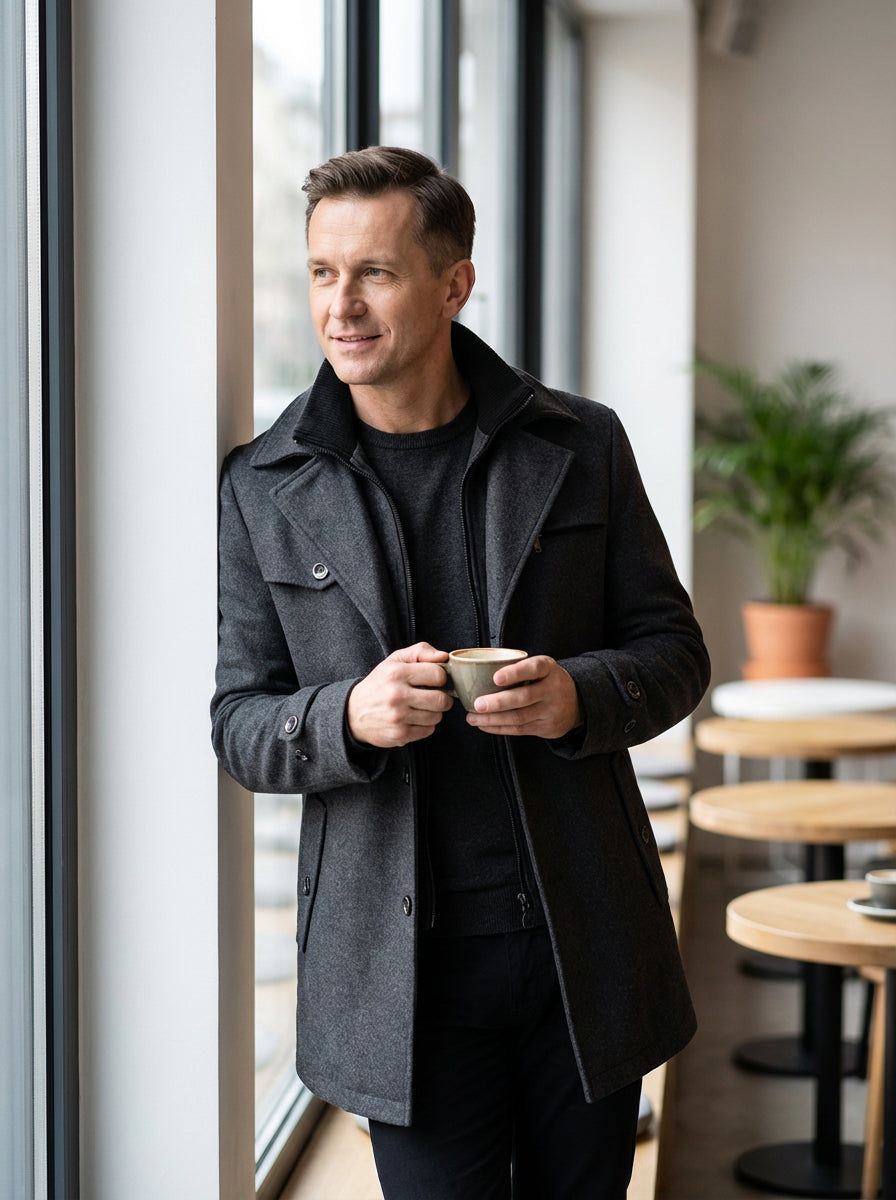 Męski Płaszcz z Podszewką i Stójką | Klasyczny Krój | Jesienno-Zimowy Styl
