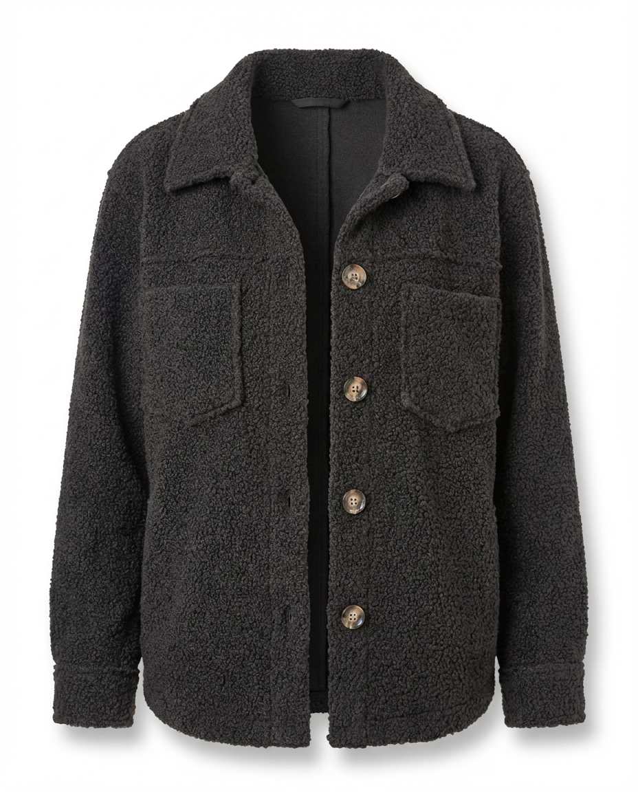 Szukasz kurtki, która otuli Cię miękkością i dopełni codzienne stylizacje? Ta kurtka z tkaniny barankowej to idealny wybór na chłodniejsze dni. Krótki, luźny krój, klasyczny kołnierz i guziki na całej długości tworzą swobodny, miejski look. Duże naszywane kieszenie dodają funkcjonalności i stylowego wyrazu.