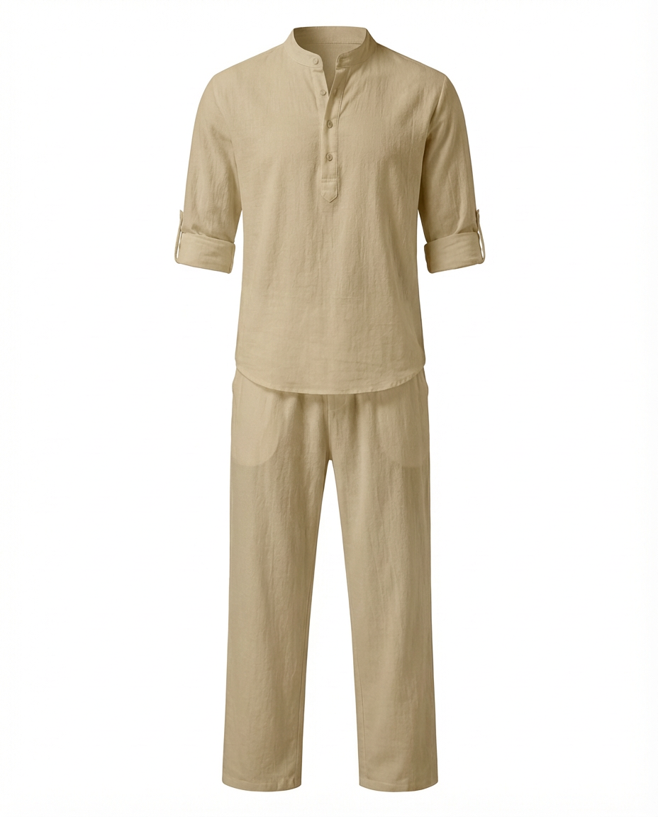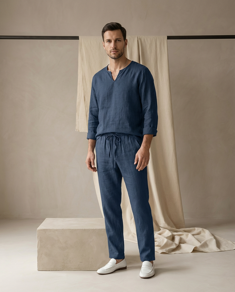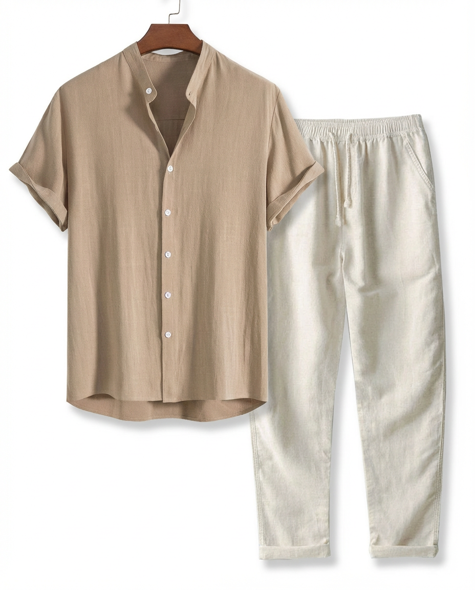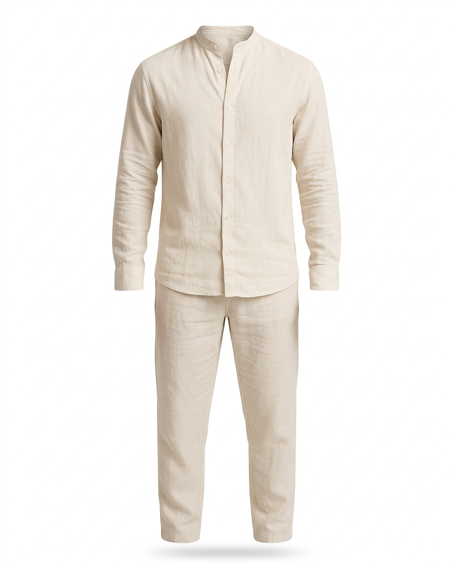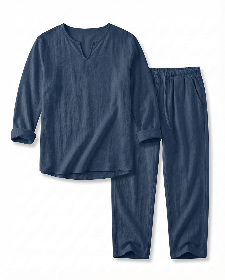 Męski Komplet z Lekkiej Tkaniny | Koszula z Długim Rękawem i Spodnie | Swobodny Styl na Ciepłe Dni